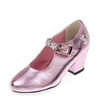 Pantofelki na obcasie Madeleine holenderskiej marki Souza! to piękne, kunsztownie wykonane buciki, np. do sukienki wizytowej, przebrania księżniczki, elfa lub wróżki. Zachwycają dbałością o detale. Obuwie zrobione jest ze skóropodobnego, przyjemnego w dotyku metalicznego materiału w kolorze różowym. Jest zapinane na pasek z boczną sprzączką. Ma zaokrąglony, komfortowy nosek, szeroki, niewysoki (4 cm) obcas i kwiatowe aplikacje – trzy na boku bucika i trzy na pasku. Buty posiadają gumową podeszwę, są antypoślizgowe, ciche i nie rysują powierzchni.