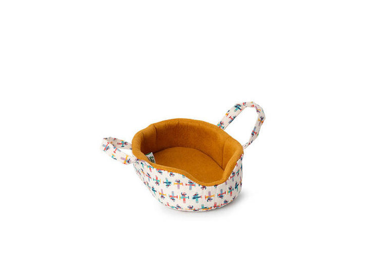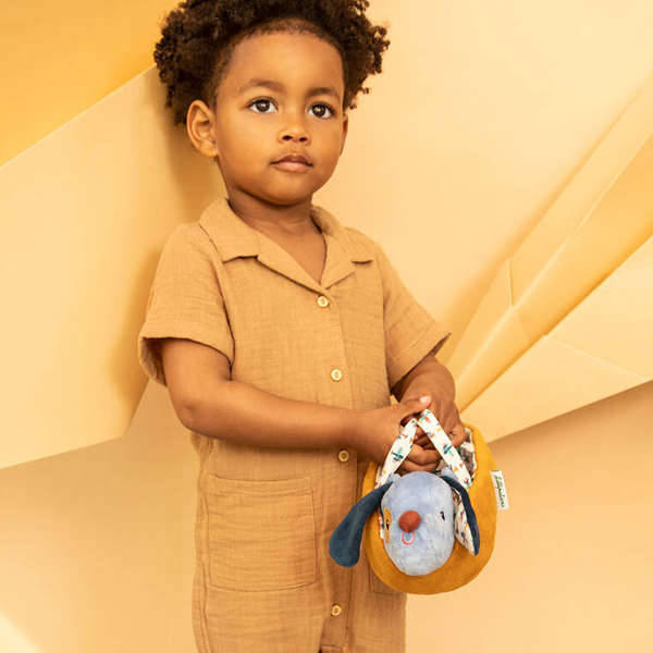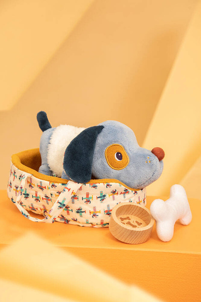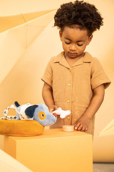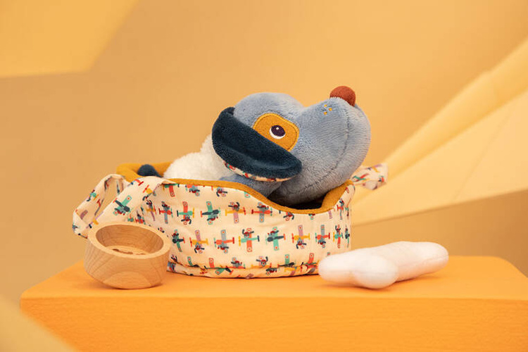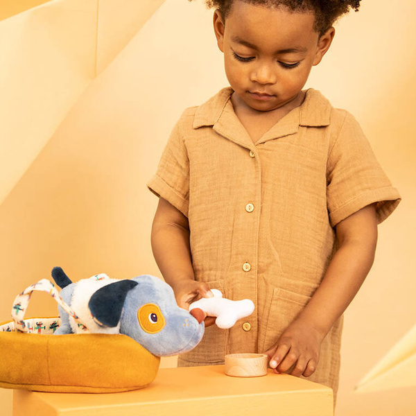 Przytulanka Piesek Jules z koszyczkiem i akcesoriami belgijskiej marki Lilliputiens jest idealna do tulenia, usypiania, uspokajania, zabierania na spacer czy zabawy. Pieska można układać do snu w dwustronnym (musztardowym po jednej oraz we wzorek w samoloty po drugiej stronie) legowisku z rączkami, przenosić, ubierać w białą futerkową kamizelkę, np. przed wyjściem w chłodniejsze dni, karmić z drewnianej miseczki czy bawić się z nim pluszową kostką. Piesek ma długie uszy, uroczy okrągły nosek i łatkę na oku oraz… szczeka po naciśnięciu pyszczka! Zabawka oraz dołączone do niej akcesoria są perfekcyjnie wykończone, z dbałością o każdy szczegół i w pełni bezpieczne dla dziecka. Zabawka stymuluje rozwój motoryczny dziecka, powala mu ogrywać role i oswajać codzienność, pomaga także w nauce empatii wobec zwierząt.