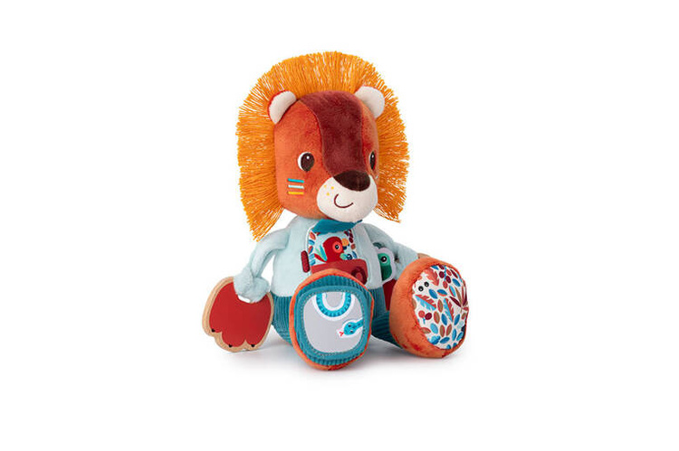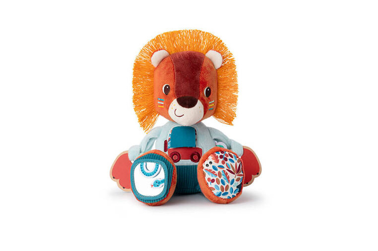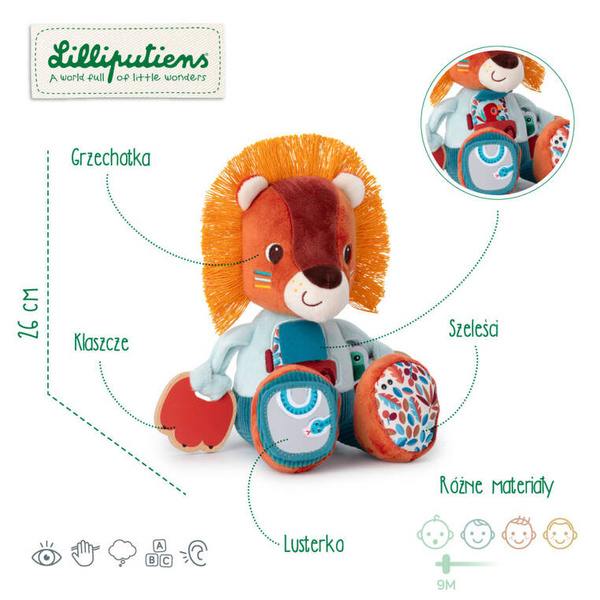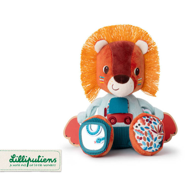 Przytulanka aktywizująca z kolekcji Lew Jack belgijskiej marki Lilliputiens to niebanalne, miękkie i wielofunkcyjne źródło rozrywki i nauki dla ciekawskich maluszków. Ma postać pomarańczowo-brązowego lwa w niebieskim ubranku. Lew ma nieduże uszka, bujną grzywę oraz łapki zakończone drewnianymi klekotkami. Na brzuszku ma aplikację autka z odchylanym elementem, a na spodzie jednej z nóg – bezpieczne, miękkie lusterko z grafiką robaczka. Druga noga szeleści przy pocieraniu, natomiast głowa lwa – grzechocze.
