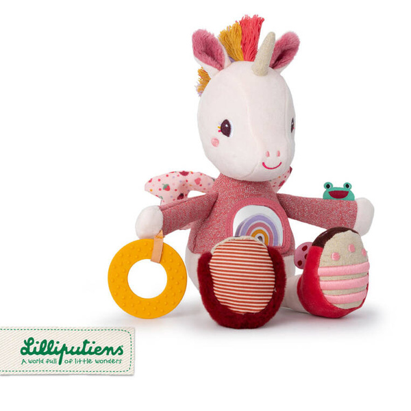 Przytulanka aktywizująca z kolekcji Jednorożec Lena belgijskiej marki Lilliputiens to niebanalne, miękkie i wielofunkcyjne źródło rozrywki i nauki dla ciekawskich maluszków. Ma postać kremowego jednorożca w czerwonym sweterku i z kolorowym irokezem na głowie. Lena ma stojące uszka, róg na czole, włochaty ogonek i skrzydełka-uchwyty, które szeleszczą przy pocieraniu. Jedna z nóżek to grzechotka, a przy łapce ma zamocowany okrągły fakturowany silikonowy gryzak. Na brzuszku znajduje się bezpieczne, miękkie lusterko z naszywką tęczy.
