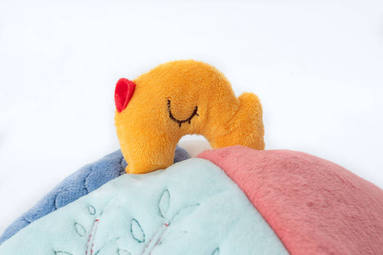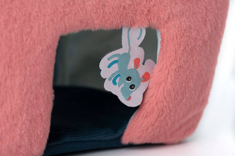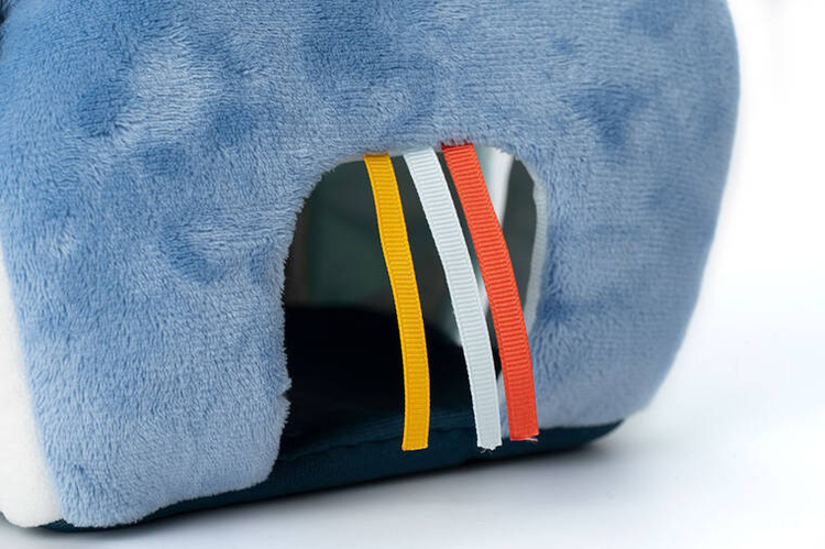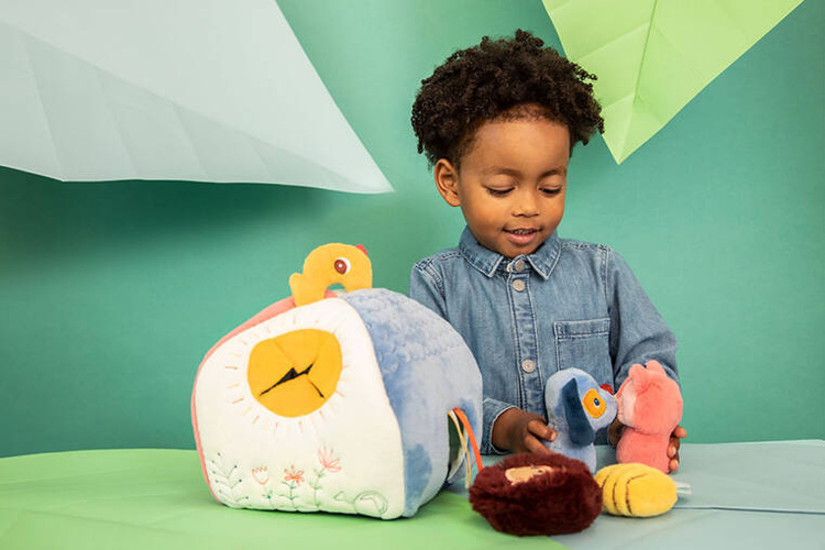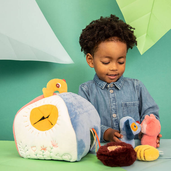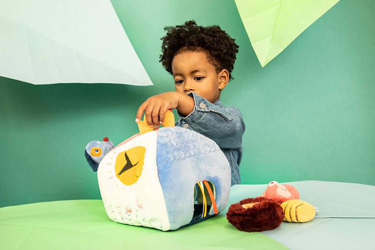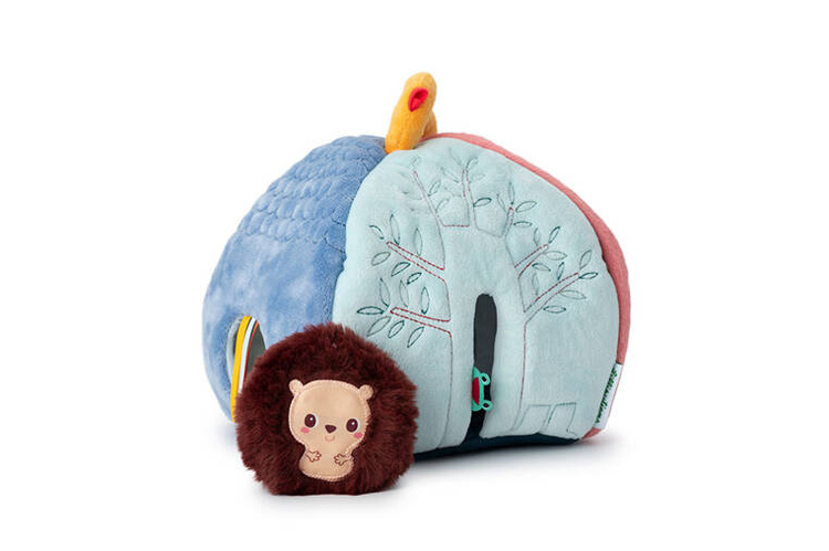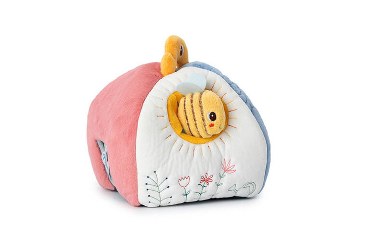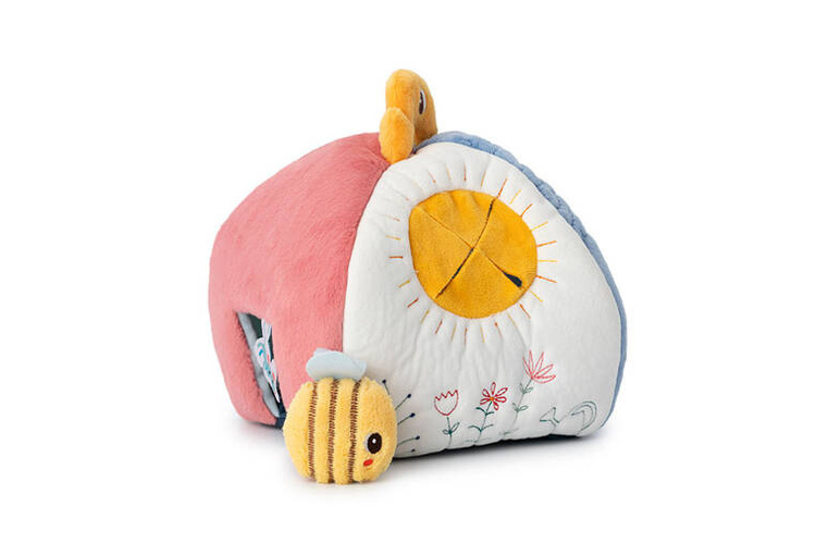 Aktywizujący miękki domek z przytulankami z kolekcji Piesek Jules belgijskiej marki Lilliputiens to niebanalne i wielofunkcyjne źródło rozrywki i nauki dla ciekawskich maluszków. Każdy bok domku przyporządkowany jest innemu bohaterowi i zapewnia nowe odkrycia sensoryczne. W różowej futerkowej ścianie z aplikacją myszki przy wejściu mieszka Kotka Jeanne, w białej ścianie znajduje się żółty nacięty otwór-słoneczko dla Pszczółki, na ścianie z ciemnoniebieskiej pluszowej tkaniny częściowo o fakturze łuski znajduje się wejście z tasiemkami dla Pieska Julesa, a na jasnoniebieskiej – drzwiczki z aplikacją żabki, przez które wchodzi Jeżyk. Na górze znajduje się uchwyt w postaci żółtego ptaszka. Każdy z bohaterów wydaje inny dźwięk – Piesek, Kotka i Pszczółka to 3 różne grzechotki, natomiast Jeżyk szeleści przy pocieraniu.