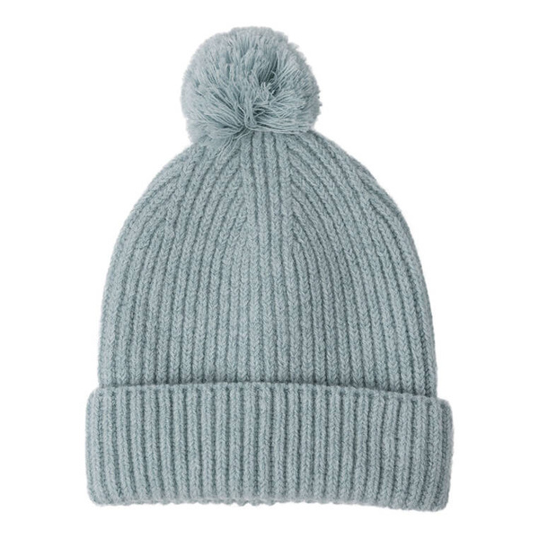 Czapeczka ma klasyczny dziergany wzór i stonowany miętowy kolor.