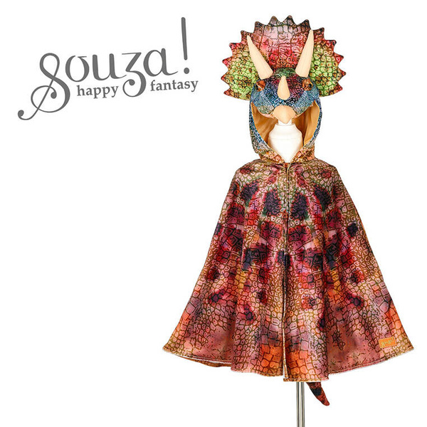 Kostium peleryna Triceratops z dużym zabudowanym kapturem, tworzącym jednocześnie maskę dinozaura holenderskiej marki Souza! to przepiękne przebranie dla chłopca. Ma wysoki imponujący grzebień, cztery rogi (dwa większe po bokach i dwa mniejsze z przodu) oraz gadzie oczy, a z tyłu – gruby ogon. Jest wielokolorowy, z nadrukowaną fakturą, imitującą skórę dinozaura. Zapinany na suwak.