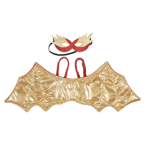Zestaw akcesoriów: miękkie skrzydła i maska Red dragon holenderskiej marki Souza! Szerokie złote skrzydła wykonane są od spodu z fakturowanej czerwonej tkaniny, imitującej smoczą skórę. Czerwona maska ma złote aplikacje ogników.