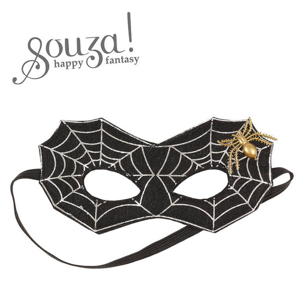 Miękka czarna maska Pająk holenderskiej marki Souza! Ozdobiona wzorem pajęczyny i sporym złotym pająkiem z tworzywa.