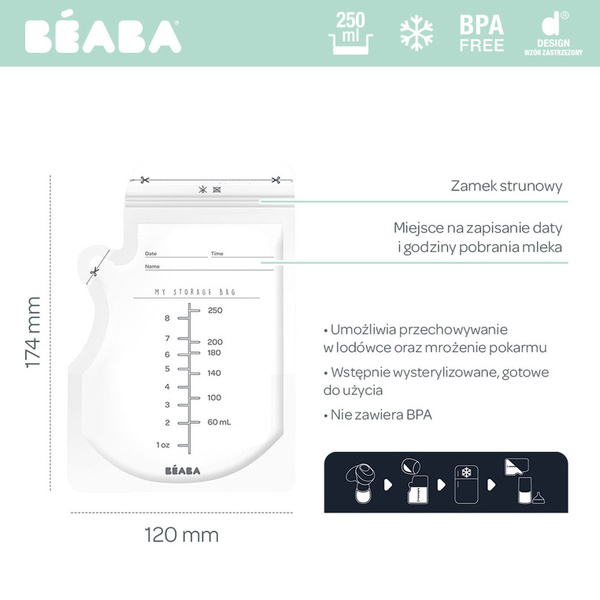 Woreczki są wstępnie wysterylizowane i gotowe do użycia. Umożliwiają bezpieczne przechowywanie mleka matki w lodówce lub zamrażarce. Każdy woreczek posiada etykietę do zapisania daty i godziny pobrania mleka oraz czytelną podziałkę w mililitrach (ml) i uncjach (oz). Optymalna pojemność każdego woreczka (250 ml) odpowiada średnio jednemu posiłkowi dziecka.