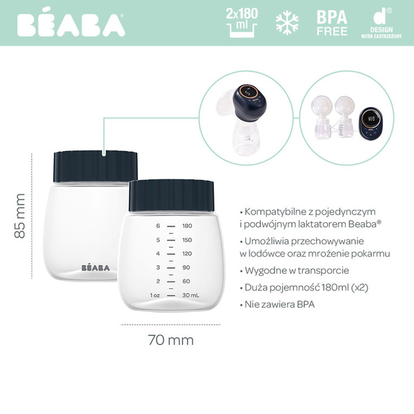 Zestaw dwóch dodatkowych pojemników-butelek na mleko o pojemności 180 ml każdy. Kompatybilne z pojedynczym i podwójnym laktatorem elektrycznym francuskiej marki BEABA. Posiadają czytelne podziałki na mililitry (ml) i uncje (oz) oraz szczelne nakrętki. Idealne do zbierania, transportu i przechowywania mleka matki. Nadają się do chłodzenia i mrożenia.