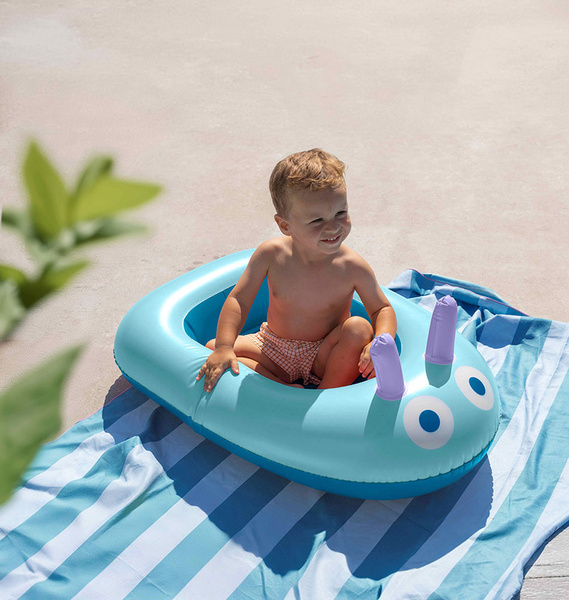 Ponton jest stabilny, ma grube brzegi, antypoślizgowe dno i intensywne kolory: ciemno- i jasnoniebieski z dużymi oczami i lawendowymi czółkami, które maluch może trzymać podczas dryfowania.