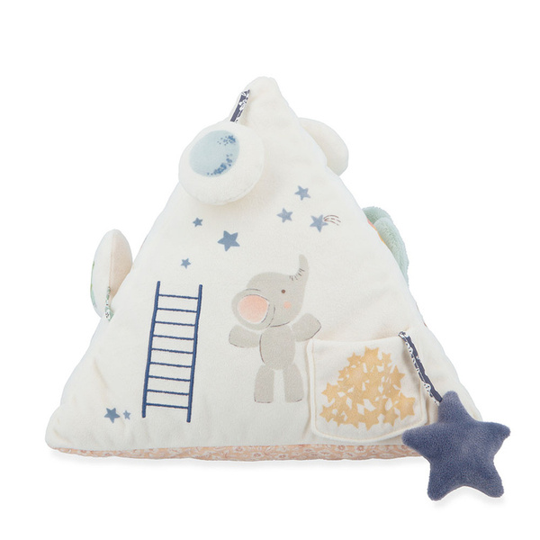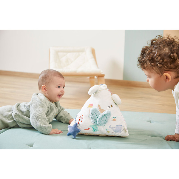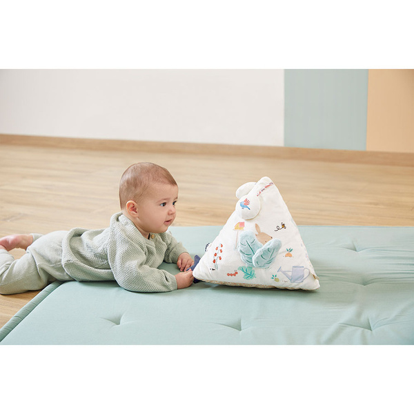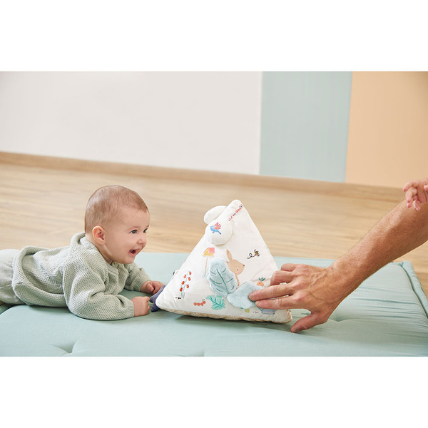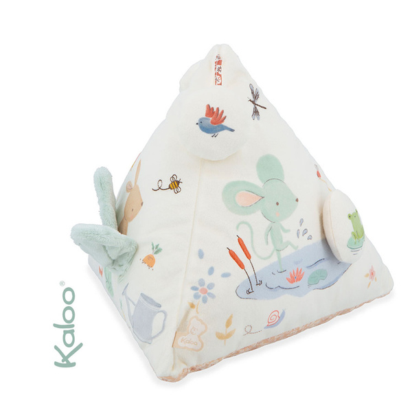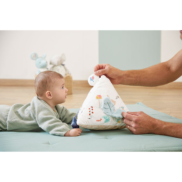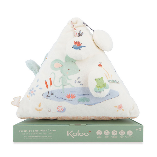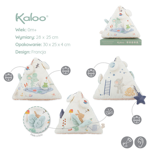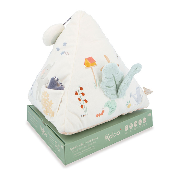 Miękka, sensoryczna piramida francuskiej marki KALOO to idealna zabawka dla Twojego maluszka, bezpieczna już od pierwszych dni życia. Każda ze stron piramidy kryje inne aktywności stymulujące zmysły: wzrok, dotyk, słuch oraz zdolności motoryczne maluszka – 4 rodzaje grzechotek, okienko peek a boo, elementy szeleszczące przy pocieraniu oraz kieszonkę. Dodatkowo każdą z trzech ścianek zdobi inna ciekawa historia zachęcająca do snucia własnych opowieści – o króliczku w ogrodzie, o zielonej myszce i o mrugających gwiazdkach.