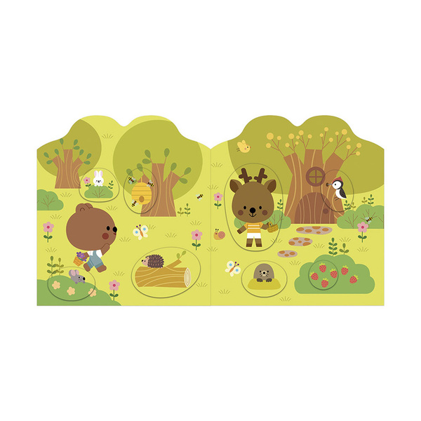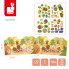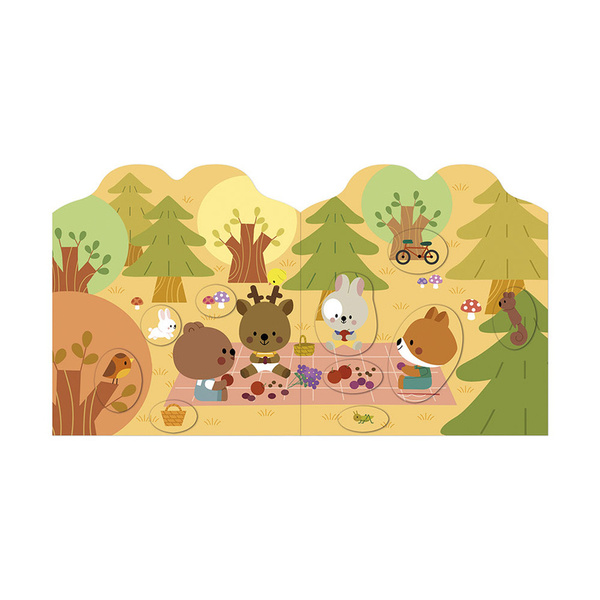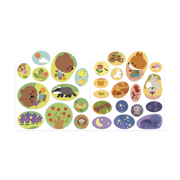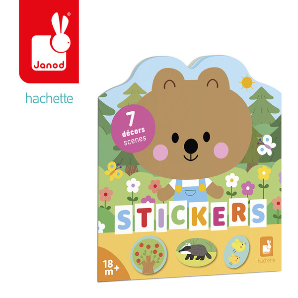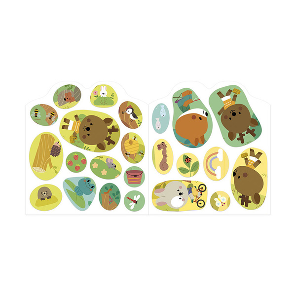 Książeczka do wyklejania z naklejkami Las francuskiej marki JANOD. Książeczka zawiera wewnątrz 7 różnych scen z pustymi miejscami do wypełnienia naklejkami. Dziecko może śledzić losy bohaterów opowieści – leśnych zwierzątek - opowiadać o nich i jednocześnie samodzielnie uzupełniać ilustracje załączonymi do książki naklejkami (ponad 50 szt.).