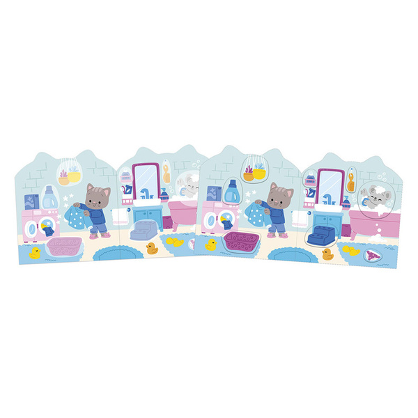 Książeczka do wyklejania z naklejkami Dom francuskiej marki JANOD. Książeczka zawiera wewnątrz 7 różnych scen z pustymi miejscami do wypełnienia naklejkami. Dziecko może śledzić losy bohatera – szarego kotka – podczas jego codziennych aktywności, opowiadać o nich i jednocześnie samodzielnie uzupełniać ilustracje załączonymi do książki naklejkami (ponad 50 szt.).