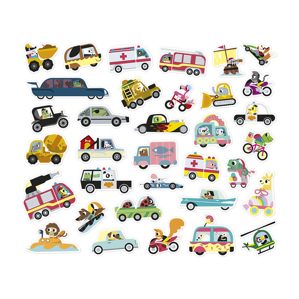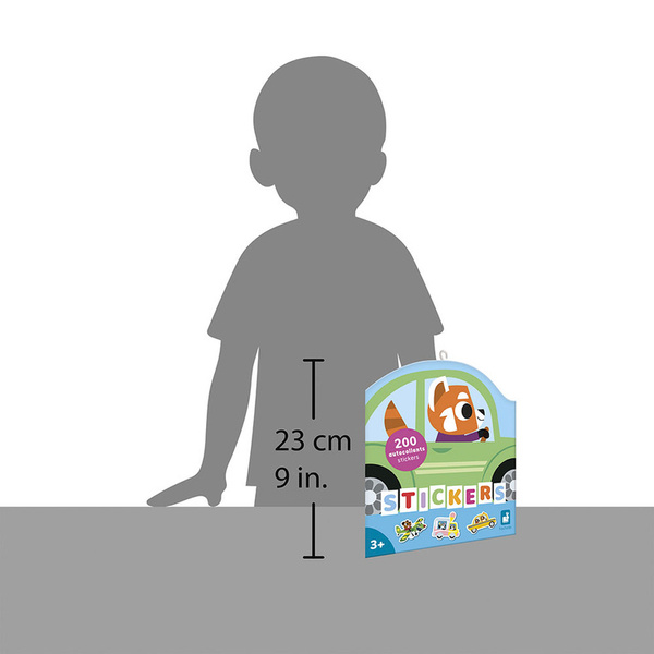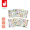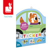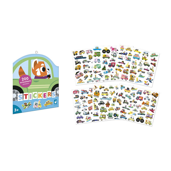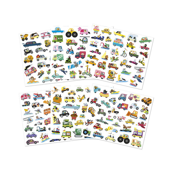 Zestaw naklejek Pojazdy francuskiej marki JANOD zawiera 200 szt. naklejek, rozmieszczonych na 6 arkuszach (17 x 20 cm każdy). Naklejki są odpowiednie dla dzieci od 3. roku życia – mają optymalny dla małych rączek rozmiar. Naklejki przedstawiają różne, w tym rzadko spotykane już pojazdy, np. monocykl, helikopter, skuter wodny, tandem czy monster trucka.