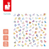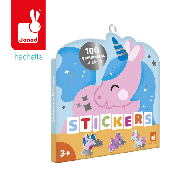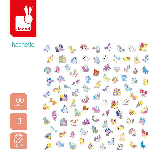 Zestaw naklejek Jednorożce francuskiej marki JANOD zawiera 100 szt. wyciętych po obrysie naklejek. Naklejki są odpowiednie dla dzieci od 3. roku życia – mają optymalny rozmiar (ok. 5 x 5 cm każda) i nacięcie na spodzie dla łatwiejszego odklejania. Naklejki przedstawiają urocze, baśniowe jednorożce. Połowa z nich posiada połyskującą, metaliczną powierzchnię, co dodaje im wyjątkowego uroku.