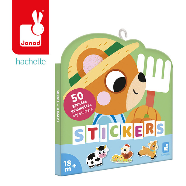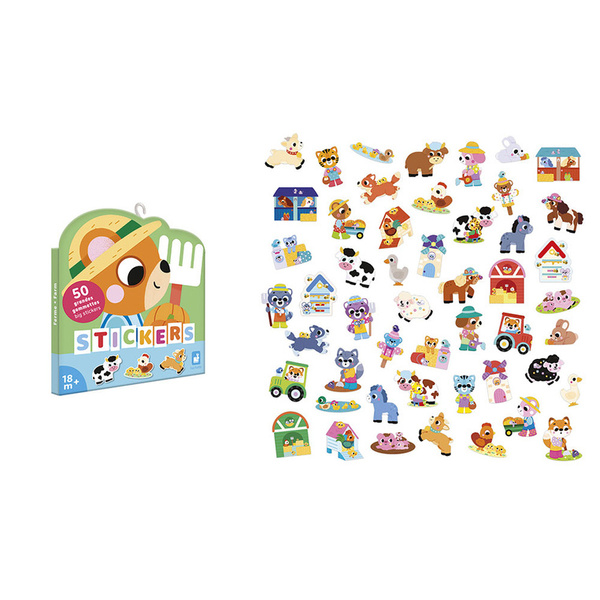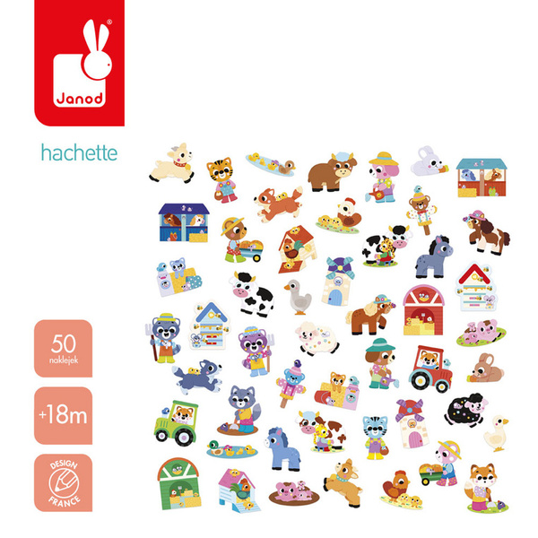 Zestaw naklejek Farma francuskiej marki JANOD zawiera 50 szt. dużych, wyciętych po obrysie naklejek. Naklejki są odpowiednie dla dzieci już od 18 miesiąca życia – mają optymalny dla małych rączek rozmiar (ok. 7 x 8 cm każda) i nacięcie na spodzie dla łatwiejszego odklejania. Naklejki przedstawiają urocze scenki z życia zwierząt na farmie, np. kota w młynie, koni w stajni czy misia z taczką, pełną dyń.