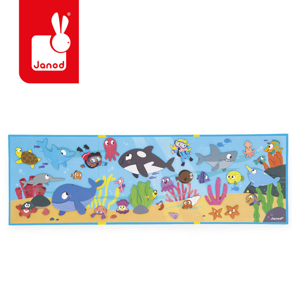 Magnetyczna układanka Podwodny świat z linii Magneti'stories francuskiej marki Janod zawiera 30 magnesów – oceanicznych stworzeń, nurków, roślinności i innych elementów podwodnego krajobrazu. Stanowią one części składowe do stworzenia oryginalnej ilustracji na rozkładanej potrójnej planszy. Magnesy pozwalają na układanie obrazów i wymyślanie opowieści wg własnych pomysłów. To świetna rozrywka dla wszystkich twórczych dzieci. Układanka będzie służyć przez długi czas i z pewnością nieprędko się znudzi, ponieważ daje wiele możliwości kreacji. Rozbudza zmysł artystyczny, a ponadto ćwiczy logiczne myślenie i sprawność manualną dziecka.