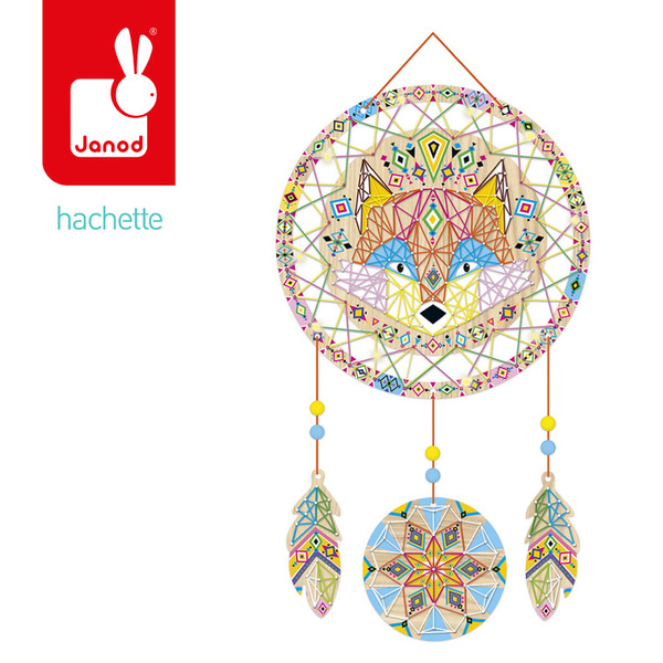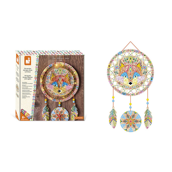 Zestaw kreatywny Łapacz snów Lis francuskiej marki JANOD zawiera wstępnie wycięte kształty z kolorowej pianki, imitującej drewno (obręcz, 2 koła i 2 pióra), 3 m linki, 10 kolorowych motków muliny (po 7 m), 500 szt. plastikowych gwoździ, 6 drewnianych koralików oraz 1 sznur lampek ledowych na baterie (z bateriami w komplecie). W zestawie znajduje się szczegółowa instrukcja, jak krok po kroku stworzyć misterną podświetlaną ozdobę – łapacz snów.