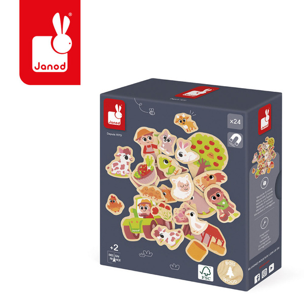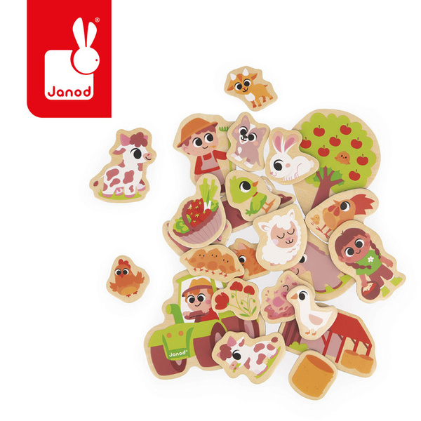 Zestaw drewnianych magnesów Na farmie francuskiej marki Janod to wspaniały prezent dla kilkulatka. Zestaw zawiera 24 magnesy różnej wielkości, nawiązujące do tematyki farmy, w tym: zwierzęta, rolników czy traktor.