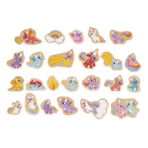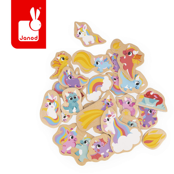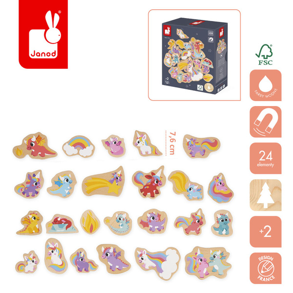 Zestaw drewnianych magnesów Jednorożce i smoki francuskiej marki Janod to wspaniały prezent dla kilkulatka. Zestaw zawiera 24 magnesy różnej wielkości, prezentujące fantastyczne stworzenia rodem z baśni.