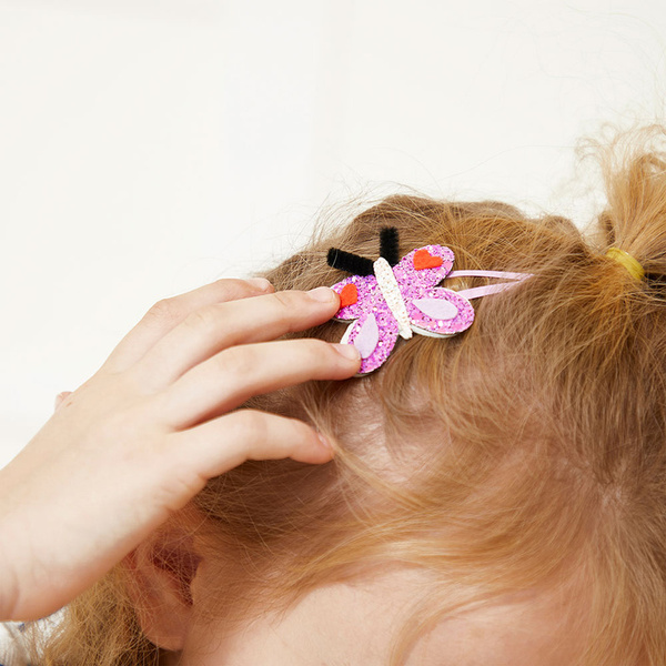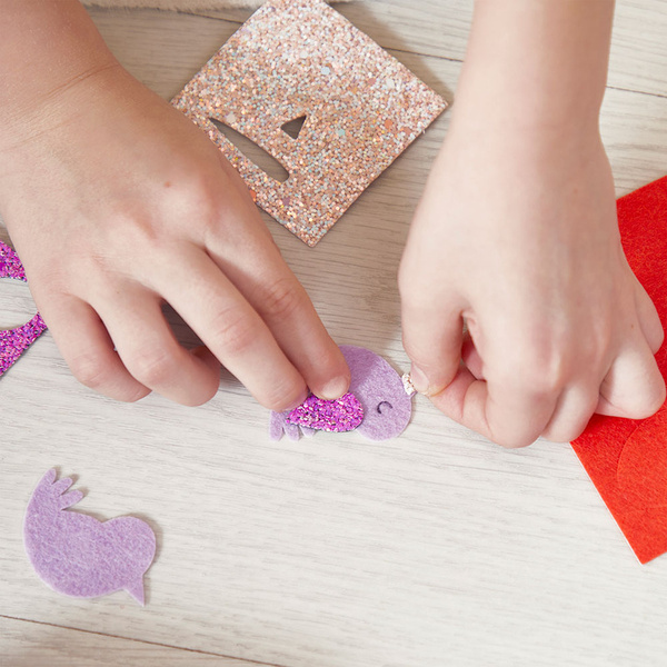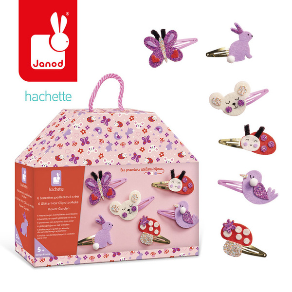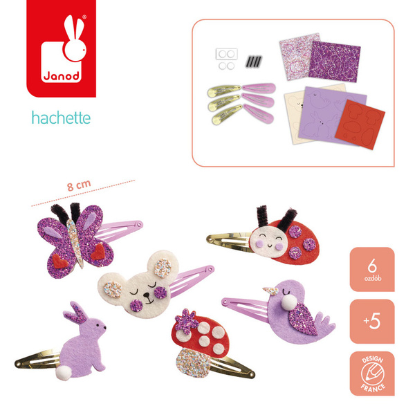 Zestaw kreatywny do tworzenia spinek do włosów Ogród francuskiej marki JANOD pozwoli stworzyć w sumie 6 sztuk wspaniałych ozdób (z biedronką, ptaszkiem, motylkiem, króliczkiem, myszką i muchomorkiem). W jego skład wchodzi 6 metalowych spinek do włosów (złotych i różowych), 3 filcowe arkusze i 2 samoprzylepne brokatowe arkusze z wstępnie wyciętymi kształtami, 2 białe mini pompony (i 2 pianki do ich przyklejenia) oraz 4 szt. „czułek”. W kilka chwil Twoje dziecko może stać się kreatywnym jubilerem! Projektowanie i tworzenie biżuterii to godziny angażującej i jednocześnie uspokajającej, wyciszającej zabawy, a po skończonej pracy powstałe dzieła mogą jeszcze długo służyć jako ozdoby lub podarunki dla bliskich. Do zestawu dołączona jest szczegółowa instrukcja jak wykonać poszczególne ozdoby.