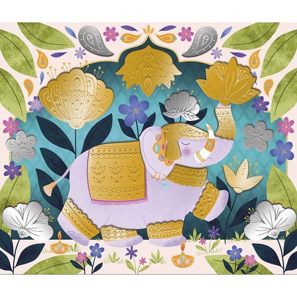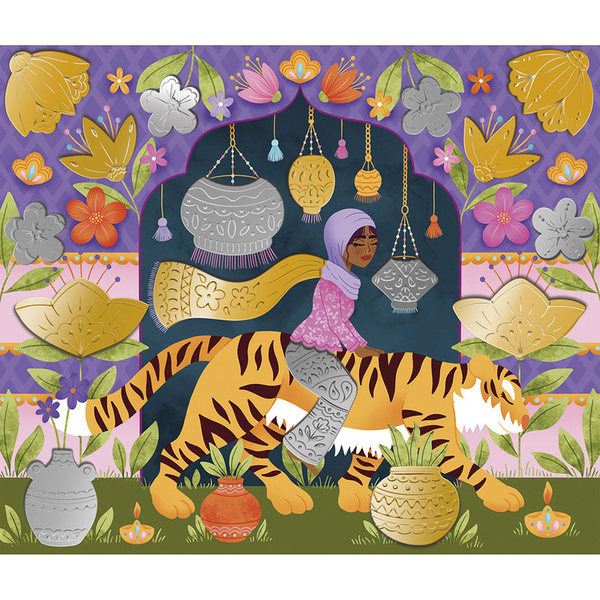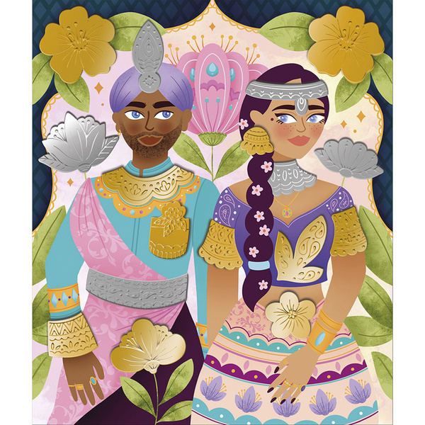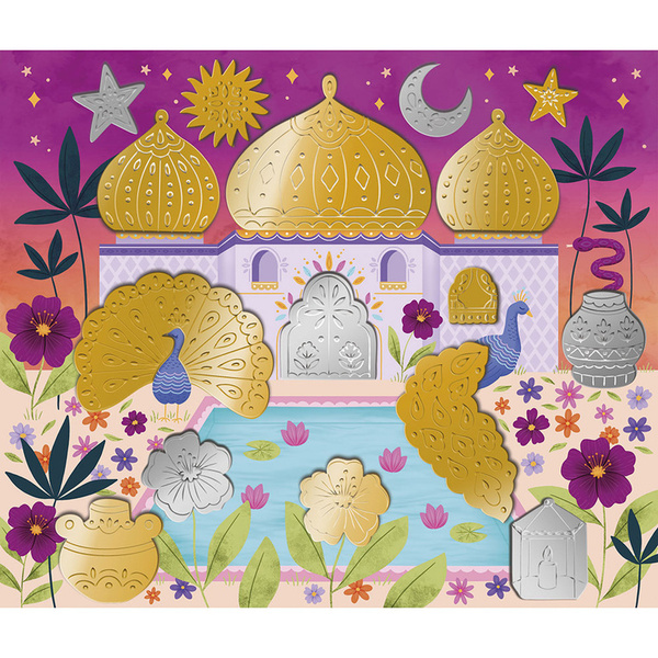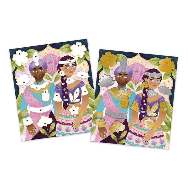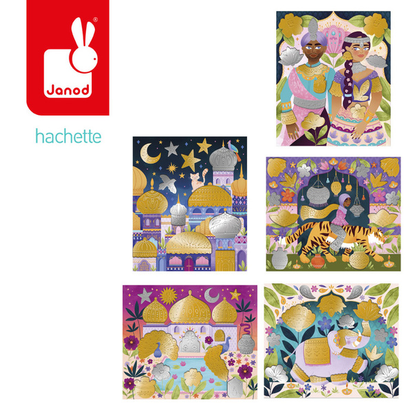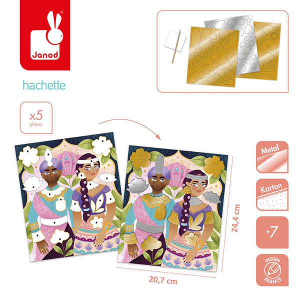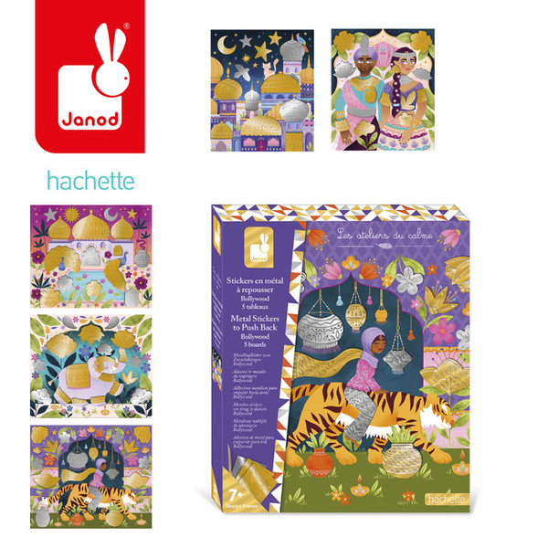 Zestaw kreatywny Metalowe naklejki Bollywood francuskiej marki JANOD zawiera 5 plansz-obrazków (20,7 x 24,4 cm), przedstawiających sceny rodem z bollywoodzkich filmów. Do ilustracji należy w odpowiednich miejscach przykleić dołączone do zestawu metalowe naklejki, które najpierw trzeba wytłoczyć zgodnie z załączoną instrukcją. W komplecie są 2 arkusze złotych i 1 arkusz srebrnych naklejek oraz drewniana szpatułka z zaostrzonym końcem co ich wytłaczania.