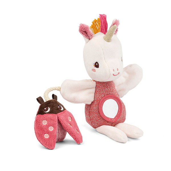 Pacynka aktywizująca wielofunkcyjna Jednorożec Lena belgijskiej marki Lilliputiens to idealna pierwsza zabawka dla niemowląt. Ma postać jednorożca, którego można ożywiać po wsunięciu palców w jego łapki. W główce znajduje się grzechotka, na brzuszku miękkie lusterko, a przy jednej z łapek – różowa biedronka na sznurku, która szeleści przy pocieraniu. Ponadto jednorożec ma stojące uszka, dłuższe nóżki, tęczową grzywę i róg na czole. Zabawka jest solidnie wykonana i bezpieczna. Rozwija małą motorykę (chwytanie, potrząsanie), aktywizuje zmysł słuchu (grzechocze, szeleści), wzroku (lusterko) i dotyku (zróżnicowane tkaniny i liczne wypustki).