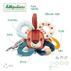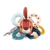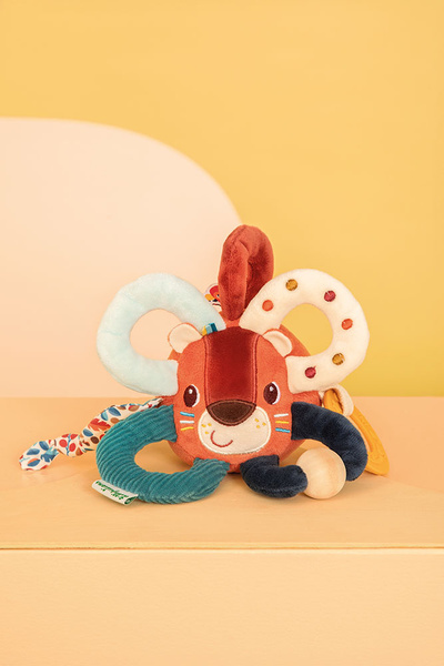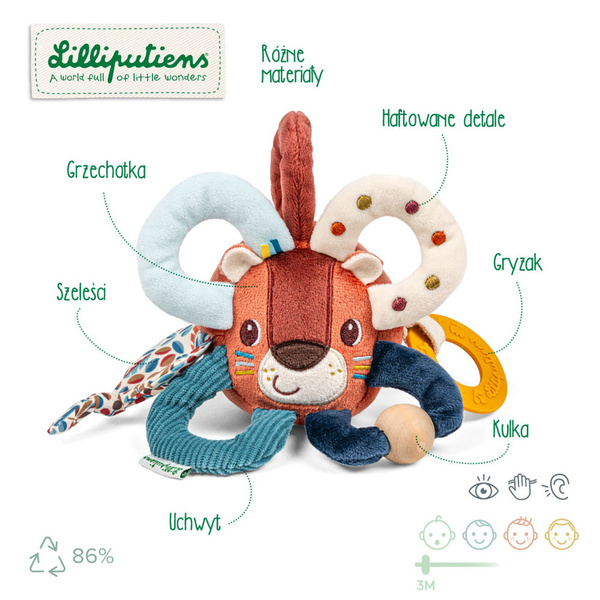 Piłeczka aktywizująca wielofunkcyjna Lew Jack belgijskiej marki Lilliputiens to idealna pierwsza zabawka dla niemowląt. Ma postać lwa, którego grzywę tworzą liczne miękkie uchwyty z różnych tkanin i z różnymi detalami, m.in. supełkiem, drewnianym koralikiem do przesuwania, wypukłym haftem czy szeleszczącym wypełnieniem. W piłce-główce znajduje się ponadto grzechotka, a na zawieszce – silikonowy fakturowany gryzak. Zabawka jest solidnie wykonana i bezpieczna. Rozwija małą motorykę (chwytanie, potrząsanie, przesuwanie), aktywizuje zmysł słuchu (grzechocze, szeleści) i dotyku (zróżnicowane tkaniny i liczne wypustki).