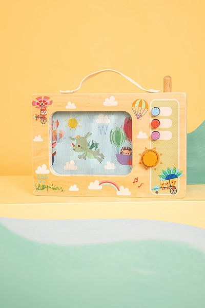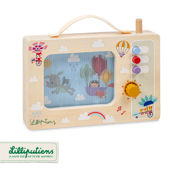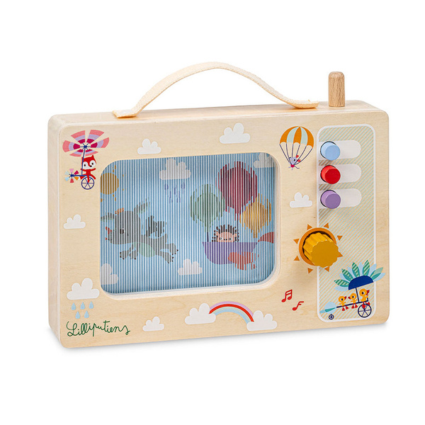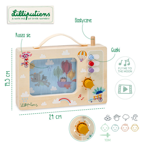 Drewniana animowana pozytywka w kształcie telewizora z kolekcji Smok Joe belgijskiej marki Lilliputiens to niebanalne wielofunkcyjne źródło rozrywki i nauki dla ciekawskich maluszków. Zabawka posiada wiele funkcji: ekran z ruchomymi postaciami lecących w chmurach zwierząt, m.in. smoka, lisiczki czy jeżyka, panel z pokrętłem do nakręcania pozytywki i guziczkami, antenkę czy uchwyt do wygodnego przenoszenia. Odtwarza przyjemną jazzową melodię „Fly me to the moon”. Pozytywka jest solidnie wykonana, bezpieczna, pomalowana farbami na bazie wody. Zaskakuje i pobudza wyobraźnię. Rozwija koordynację ręka-oko, małą motorykę (przekręcanie, chwytanie), aktywizuje zmysł słuchu (muzyka) i wzroku (animacja).