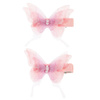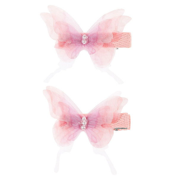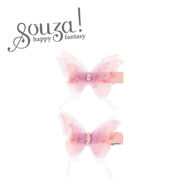 Komplet dwóch spinek do włosów z tiulowymi motylami Thyrza holenderskiej marki Souza! Na każdej z nich znajduje się aplikacja jasnoróżowego motylka wykonanego z kilku warstw tiulu oraz środkiem z małych koralików. Metalowa część spinek pokryta jest jasnoróżowym materiałem (rypsową wstążką). Ząbkowane zaciski sprawiają, że ozdoby stabilnie trzymają się włosów. Idealne zarówno na przyjęcia, jak i na co dzień. Nadają się także na prezent.