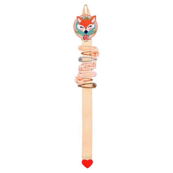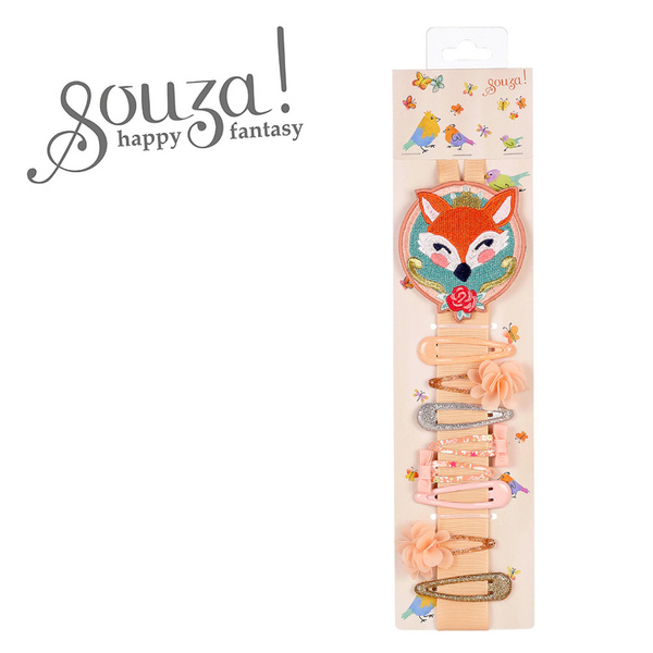 Komplet ośmiu spinek do włosów z wieszaczkiem z aplikacją liska Resi holenderskiej marki Souza! Spinki – każda inna – są w odcieniach różu, brzoskwini, złota i brązu, dwie z nich ozdobione są tiulowymi kwiatkami, a inne dwie – kokardkami. Zaciski na klik sprawiają, że ozdoby stabilnie trzymają się włosów. W zestawie znajduje się tasiemka z haczykiem do zawieszenia przy toaletce, w łazience czy dziecięcym pokoju, która ułatwi zachowanie porządku. Komplet jest idealny zarówno na przyjęcia, jak i na co dzień. Nadaje się także na prezent.