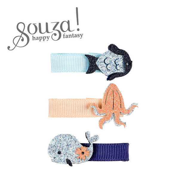 Komplet trzech spinek do włosów ze zwierzątkami morskimi Rifka holenderskiej marki Souza! Na każdej z nich znajduje się inna brokatowa aplikacja: rybka, kalmar oraz wieloryb. Metalowa część spinek pokryta jest materiałem (rypsową wstążką). Ząbkowane zaciski sprawiają, że ozdoby stabilnie trzymają się włosów. Idealne zarówno na przyjęcia, jak i na co dzień. Nadają się także na prezent.