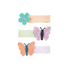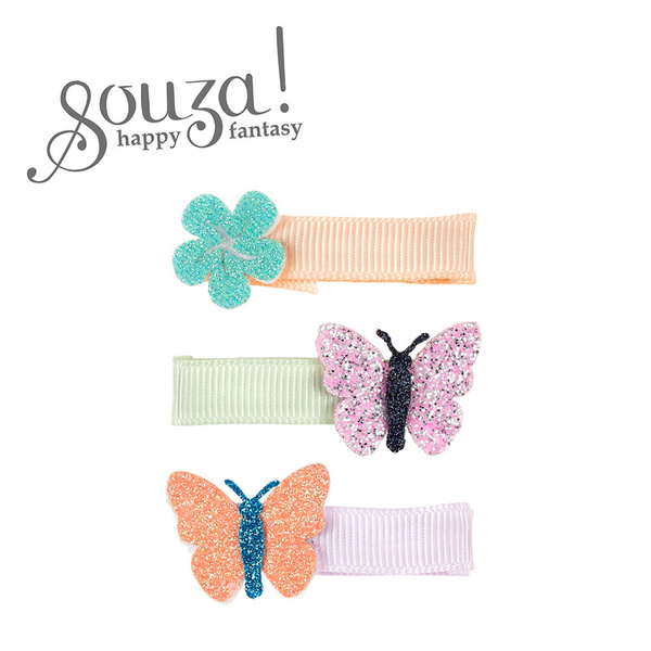 Komplet trzech spinek do włosów z motylami Yke holenderskiej marki Souza! Na każdej z nich znajduje się brokatowa inna aplikacja – są to dwa motyle (brzoskwiniowy oraz liliowy) i kwiatek (turkusowy). Metalowa część spinek pokryta jest materiałem (rypsową wstążką). Ząbkowane zaciski sprawiają, że ozdoby stabilnie trzymają się włosów. Idealne zarówno na przyjęcia, jak i na co dzień. Nadają się także na prezent.