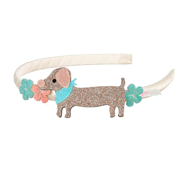 Opaska z brokatowymi kwiatkami i jamnikiem Puck holenderskiej marki Souza! Obciągnięta perłową wstążką opaska ma 1 cm szerokości. Zdobią ją urocze brokatowe aplikacje – kwiatki i jamnik z chusteczką na szyi. Opaska jest lekka, delikatna i przyjemna w noszeniu (nie uciska). Idealna zarówno na przyjęcia, jak i na co dzień. Sprawdzi się także jako stylowy prezent.