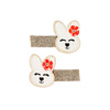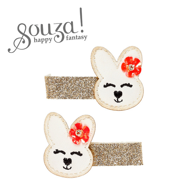 Komplet dwóch spinek do włosów z króliczkami Rena holenderskiej marki Souza! Na każdej z nich znajduje się aplikacja – biały króliczek z czerwonym kwiatkiem przy uchu. Metalowa część spinek pokryta jest złotym brokatem. Ząbkowane zaciski sprawiają, że ozdoby stabilnie trzymają się włosów. Idealne zarówno na przyjęcia, jak i na co dzień. Nadają się także na prezent.