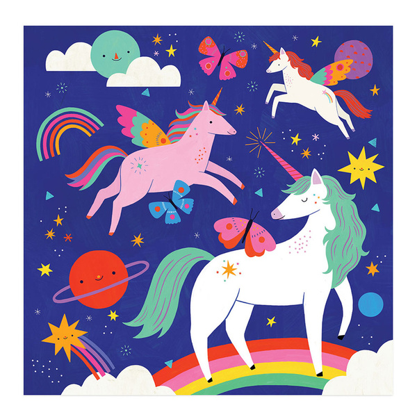 Zestaw puzzli podłogowych Magiczne jednorożce amerykańskiej marki MUDPUPPY składa się z 25 bardzo dużych, łatwych do układania elementów, w tym 6 elementów specjalnych w unikatowych kształtach, a są to: dwa motyle, planeta, kometa, tęcza oraz jednorożec. Ułożony z nich sporych rozmiarów (56 x 56 cm) obrazek przedstawia jednorożce w kosmosie. Układankę można wykorzystywać do snucia opowieści o tych magicznych stworzeniach. Wyjątkowy pomysł, design i przyjazne barwy dodatkowo zachęcają do zabawy.