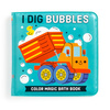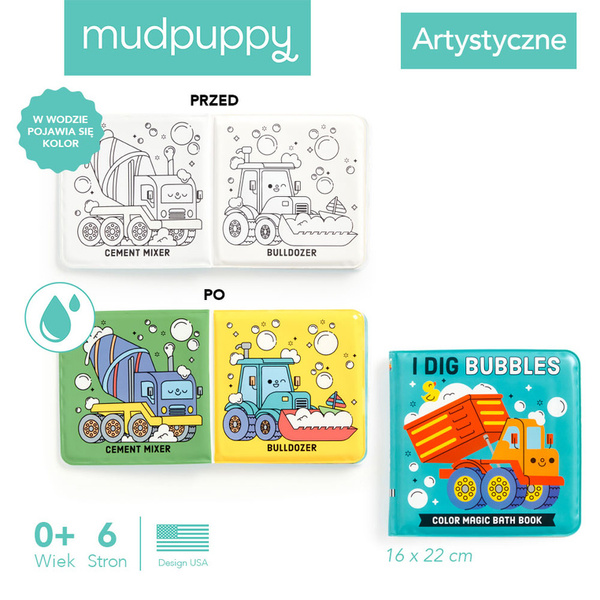 Niezwykła książeczka do kąpieli Kopalnia bąbelków amerykańskiej marki MUDPUPPY, wykonana z miękkiego, łatwego do czyszczenia i szybkoschnącego materiału. Na każdej z 6 stron znajduje się pojazd inny budowlany, np. koparka, betoniarka czy buldożer, który przewozi lub miksuje... pianę i bąbelki! Książeczka posiada „magiczne” właściwości – po zanurzeniu w wodzie na czarno-białych ilustracjach pojawiają się kolory! Zabawka zachwyca, zaskakuje i rozbudza wyobraźnię. Idealnie nadaje się na prezent.