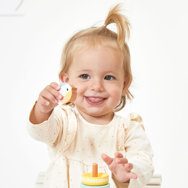 Układanka drewniana piramida Gniazdko z serii Pure francuskiej marki JANOD to kreatywna zabawka dla dzieci od 1. roku życia. Na szerszej drewnianej podstawce znajduje się drążek, na którym należy umieszczać coraz mniejsze okrągłe klocki (6 elementów) w odpowiedniej kolejności, a na czubku – drewnianego ptaszka tak, aby znalazł się on w żółtym gnieździe. Zabawka rozwija u dziecka wiele kluczowych umiejętności, m.in. chwyt i koncentrację. Zaprojektowana została we Francji. Jest zapakowana w estetyczne kartonowe pudełko. Idealnie nadaje się na prezent.