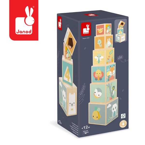 Układanka drewniana piramida-wieża z serii Pure francuskiej marki JANOD to kreatywna zabawka dla dzieci od 1. roku życia. Składa się z 6 klocków – sześcianów różnej wielkości, dzięki czemu można je układać jeden na drugim lub chować jeden wewnątrz drugiego. Klocki są poręczne i ciekawie ilustrowane postaciami zwierząt czy kolejnymi cyferkami. Mają także otwory w różnych geometrycznych kształtach. Układanka pomaga zrozumieć pojęcie rozmiarów i sekwencji, liczyć, rozróżniać kolory i figury, ćwiczyć chwyt i koncentrację. Zabawka zaprojektowana została we Francji. Jest zapakowana w estetyczne kartonowe pudełko. Idealnie nadaje się na prezent.