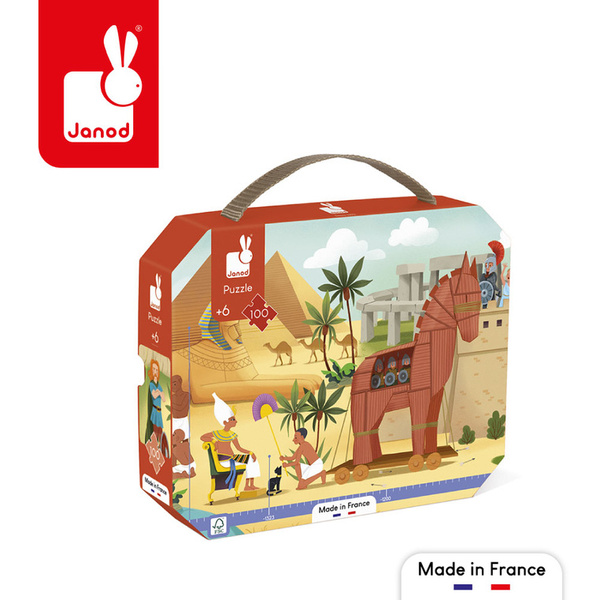 Zestaw puzzli w walizce Antyk i mitologia francuskiej marki JANOD składa się ze 100 elementów, po ułożeniu tworzących piękny i długi na 100 cm obrazek, przedstawiający pełen detali starożytny świat, m.in. Grecji czy Egiptu wraz z mitologicznymi bóstwami. Puzzle wykonane są z solidnego kartonu, zaprojektowane i wyprodukowane we Francji. Zapakowane w estetyczną walizeczkę z rączką. Idealnie nadają się na prezent.