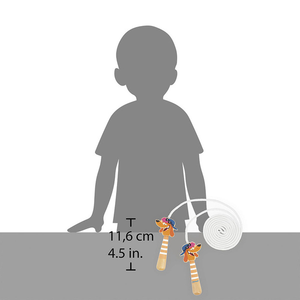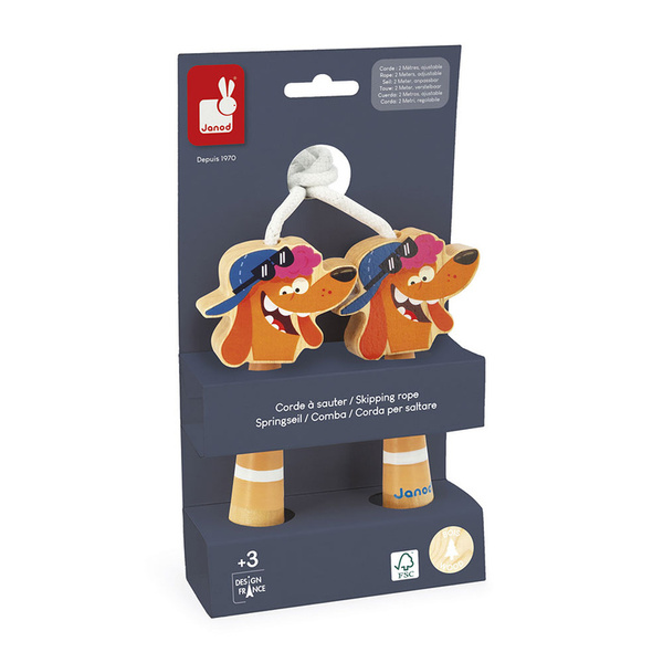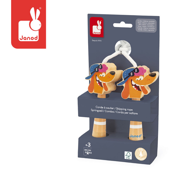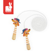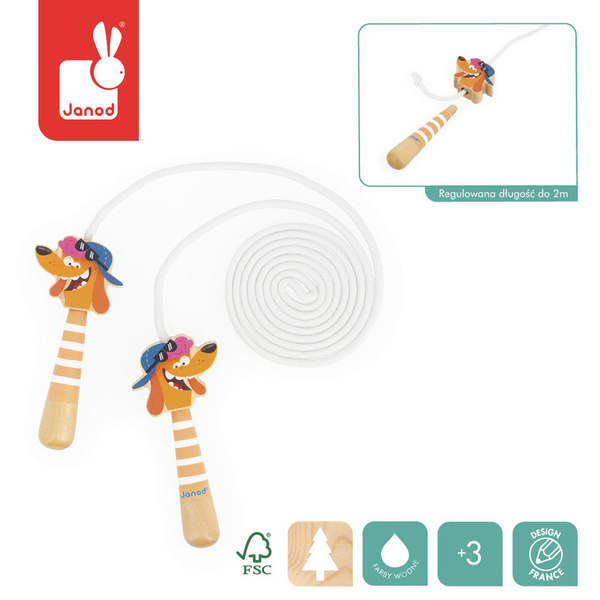 Skakanka z drewnianymi rączkami Piesek z kolekcji Applepop francuskiej marki JANOD to wspaniała zabawka sportowa. Miękki biały sznurek ma 2 metry długości (który można w razie potrzeby skrócić), a rączki ozdobione są uroczymi psiakami i mają wydłużony kształt, wygodny do trzymania przez dziecko. Skakanka to doskonała zabawka zarówno dla starszych, jak i młodszych dzieci. Zachęca do aktywności, także na świeżym powietrzu, rozwija sprawność ruchową, sprawdzi się, np. na pikniku czy urodzinowym przyjęciu.