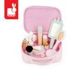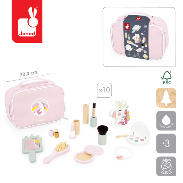 Kosmetyczka z akcesoriami z motywem przewodnim jednorożca francuskiej marki JANOD to doskonała zabawka dla małej modnisi. W skład zestawu wchodzi 10 drewnianych akcesoriów imitujących prawdziwe przybory, m.in. do makijażu: 1 lusterko z rączką, 1 paleta-tęcza z 5 cieniami i pędzelkiem, 1 szminka, 1 lakier do paznokci, 1 tusz do rzęs, 1 puder, 1 duży pędzel, 1 szczotka do włosów, 1 gumka do włosów oraz 1 buteleczka perfum (w kształcie jednorożca). Jasnoróżowa prostokątna kosmetyczka jest zapinana na suwak, ma solidną rączkę do przenoszenia i prezentuje się uroczo. Idealnie nadaje się na prezent.