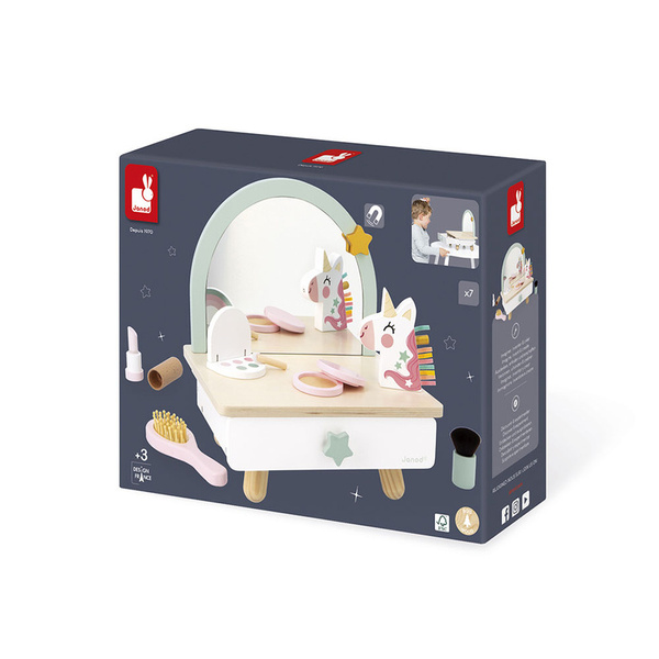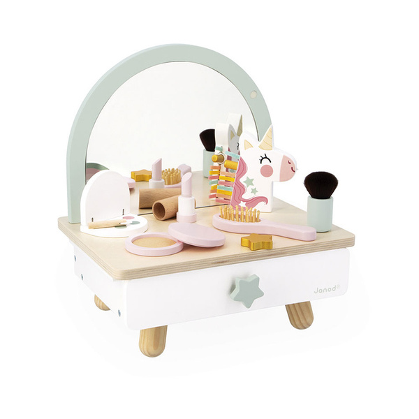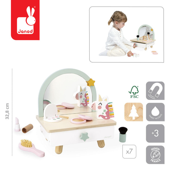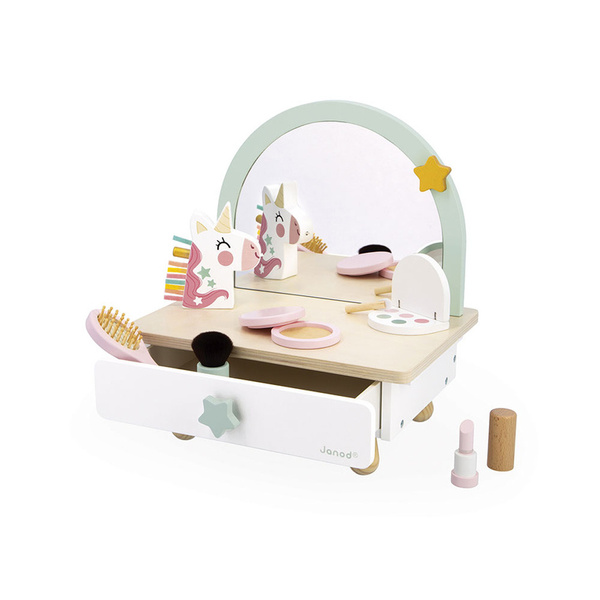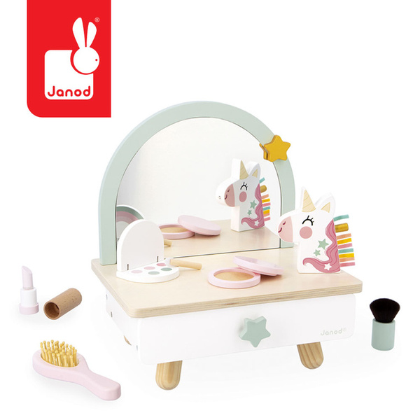 Mała toaletka z 7 akcesoriami z motywem przewodnim jednorożca francuskiej marki JANOD to doskonała zabawka dla małej modnisi. W skład zestawu wchodzi toaletka z lustrem i szufladą oraz 7 drewnianych akcesoriów imitujących prawdziwe przybory, m.in. do makijażu:: 1 paleta-tęcza z 5 cieniami i pędzelkiem, 1 szminka, 1 puder, 1 duży pędzel, 1 szczotka do włosów, 1 buteleczka perfum (w kształcie jednorożca) oraz magnes-gwiazdka, dzięki któremu można przyczepić coś do ramy lustra, np. rysunek czy notatkę. Zabawka może stanowić urocze uzupełnienie dziecięcego pokoju. Idealnie nadaje się na prezent.