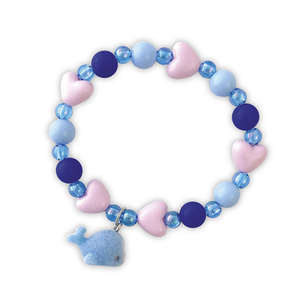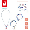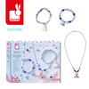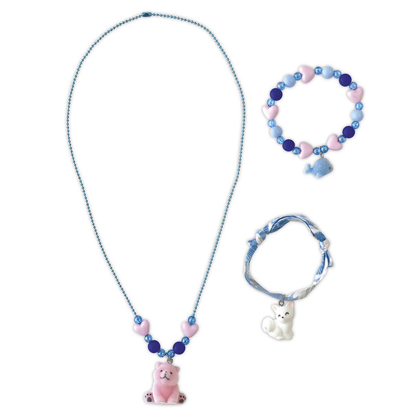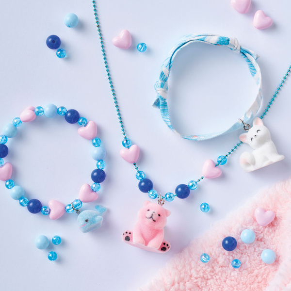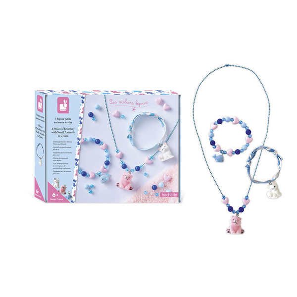 Zestaw kreatywny do tworzenia biżuterii Małe zwierzątka francuskiej marki JANOD. Pozwoli stworzyć w sumie 3 sztuki ozdób: 1 naszyjnik i 2 bransoletki. W jego skład wchodzą: koraliki w odcieniach niebieskiego, różowe perełki-serduszka, kulkowy niebieski łańcuszek, gumka jubilerska, wstążka oraz 3 zawieszki: wieloryb, niedźwiadek i biały kotek.