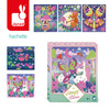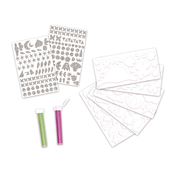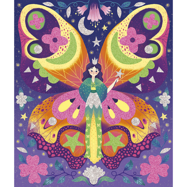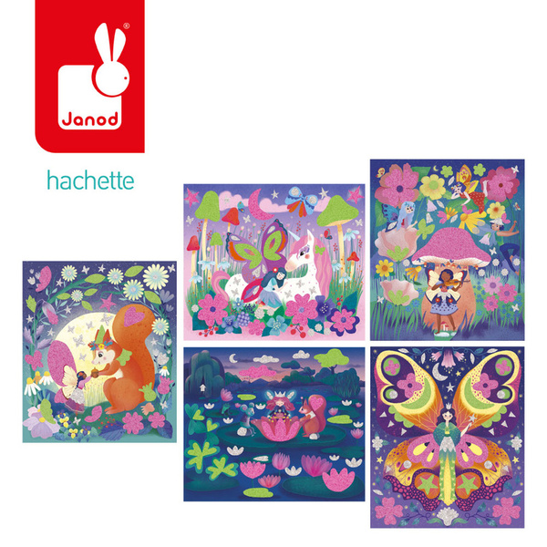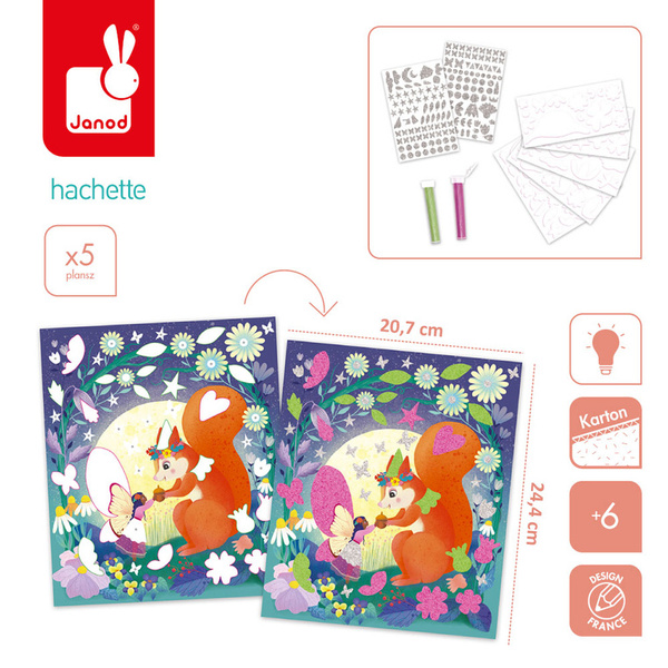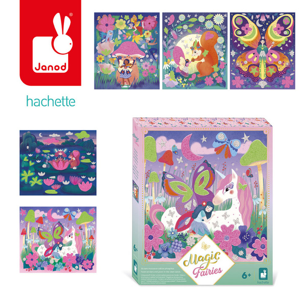 Zestaw kreatywny z piankowymi naklejkami i piaskiem Magiczny świat wróżek francuskiej marki JANOD. Zawiera 5 plansz-obrazków (20,7 x 24,4 cm), przedstawiające życie wróżek w pełnym magii lesie. Ilustracje należy w odpowiednich miejscach ozdobić fluorescencyjnym piaskiem (zielonym lub różowym) oraz piankowymi i brokatowymi naklejkami (w zestawie).