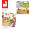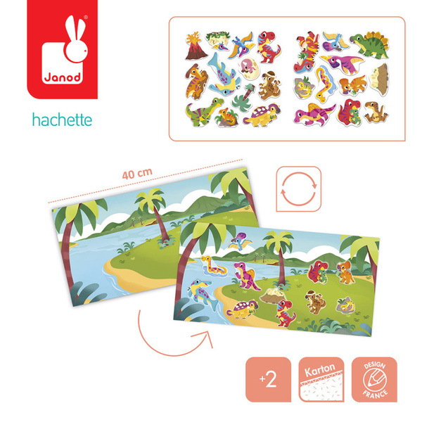 Zestaw kreatywny z naklejkami wielokrotnego użytku Dinozaury z serii My arts & crafts francuskiej marki JANOD zawiera 1 dwustronną rozkładaną planszę z obrazkami. Po jednej stronie przedstawia ona dżunglę, a po drugiej – prehistoryczny krajobraz po wybuchu wulkanu. Do zestawu dołączony jest arkusz z grubymi naklejkami, m.in.: dinozaurami i elementami ich świata. Naklejki są trwałe i wielokrotnego użytku. Dziecko może ozdabiać nimi plansze wiele razy, dowolnie zamieniając prezentowane w ten sposób historie.