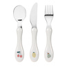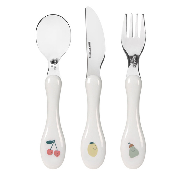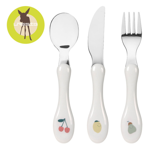 Komplet sztućców ze stali nierdzewnej niemieckiej marki LASSIG, składający się z widelca, łyżki i noża. Są lekkie i mają specjalnie profilowane kształty, co ułatwia dzieciom nabieranie pożywienia. Biała rękojeść z tworzywa – z motywem uśmiechniętych wisienek na łyżce, cytrynki na nożu i gruszki na widelczyku – również została zaprojektowana tak, by idealnie pasować do dziecięcej rączki. Dzięki przewężeniu łatwo ją złapać i utrzymać. Sztućce stanowią część większej kolekcji Happy Fruits. Możesz dobrać do nich inny produkt w tej samej gamie kolorystycznej lub z tym samym motywem.