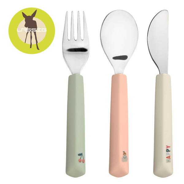 Komplet sztućców ze stali nierdzewnej niemieckiej marki LASSIG, składający się z widelca, łyżki i noża. Są lekkie i mają specjalnie profilowane kształty, co ułatwia dzieciom nabieranie pożywienia. Rękojeść z silikonu zaprojektowana została tak, by pasować do dziecięcej rączki. Jej ergonomiczny kształt z delikatnie spłaszczoną końcówką sprawia, że łatwo ją złapać i utrzymać, co wspiera rozwój samodzielności malucha. Sztućce mają kolorowe rączki: widelczyk – pastelowo zieloną z motywem uśmiechniętych wisienek, łyżka – pastelowo różową z motywem gruszki, a nożyk – kremową z kolorowym napisem HAPPY. Zestaw stanowi część większej kolekcji Happy Fruits. Możesz dobrać do niego inny produkt w tej samej gamie kolorystycznej lub z tym samym motywem.