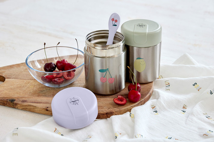 Pojemnik-termos obiadowy niemieckiej marki LASSIG przyda się nie tylko podczas podróży, ale także spacerów czy wycieczek. Ma pojemność 315 ml, jest lekki, poręczny i wytrzymały – dzięki podwójnym ściankom ze stali nierdzewnej długo zachowuje temperaturę posiłków, zarówno gorących, jak i zimnych. Szeroki otwór ułatwia napełnianie, podawanie jedzenia i czyszczenie. Hermetyczna jasnoniebieska pokrywka posiada dodatkową silikonową uszczelkę, zapewniającą szczelność naczynia. Pojemnik ma ergonomiczny kształt – zmieści się do plecaka, torebki czy bocznej kieszonki. Ma srebrny kolor z motywem uśmiechniętych wisienek. Stanowi część większej kolekcji Happy Fruits. Możesz dobrać do niego inny produkt w tej samej gamie kolorystycznej lub z tym samym motywem.