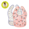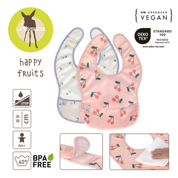 Zestaw dwóch praktycznych, łatwo zmywalnych śliniaków niemieckiej marki LASSIG. Są duże, miękkie i wykonane z wodoodpornego tworzywa. Jeden różowy z motywem uśmiechniętych wisienek (multiprint), drugi biały z kolorowym napisem HAPPY i pastelowym obszyciem. Zapięcie na rzep zapewnia komfort użytkowania. Śliniaki przeznaczone są dla dzieci od 6. do 24. miesiąca życia. Sprawdzą się przy płynnych oraz brudzących posiłkach, karmieniu i pierwszych próbach samodzielnego jedzenia. Na dole mają kieszonkę np. na resztki pokarmu, które nie trafiły do buzi. Dzięki temu masz pewność, że nie zaplamią ubrania maluszka. Stanowią część większej kolekcji Happy Fruits. Możesz dobrać do nich inny produkt w tej samej gamie kolorystycznej lub z tym samym motywem.