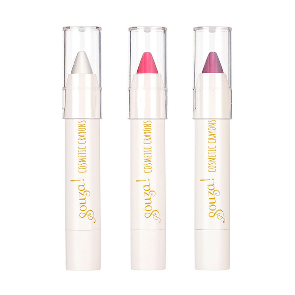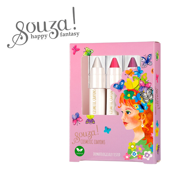 Zestaw kredek do twarzy i ciała dla dzieci holenderskiej marki Souza! Zapakowany w kartonowe pudełeczko z okienkiem, składa się z 3 sztyftów w kolorze: perłowym, różowym i fioletowym.