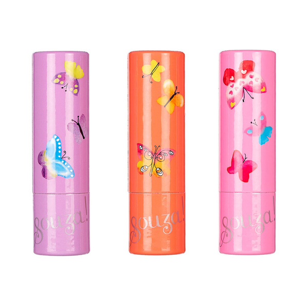 Zestaw balsamów do ust dla dzieci holenderskiej marki Souza! Zapakowany w kartonowe pudełeczko z okienkiem, składa się z 3 sztyftów (liliowy, różowy i pomarańczowy).